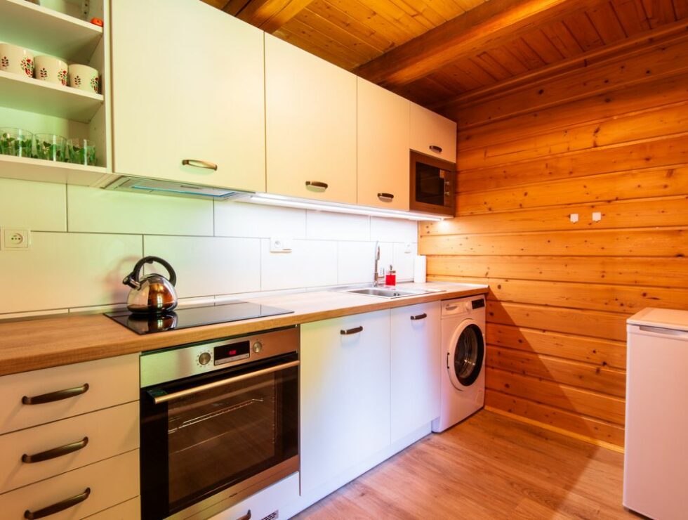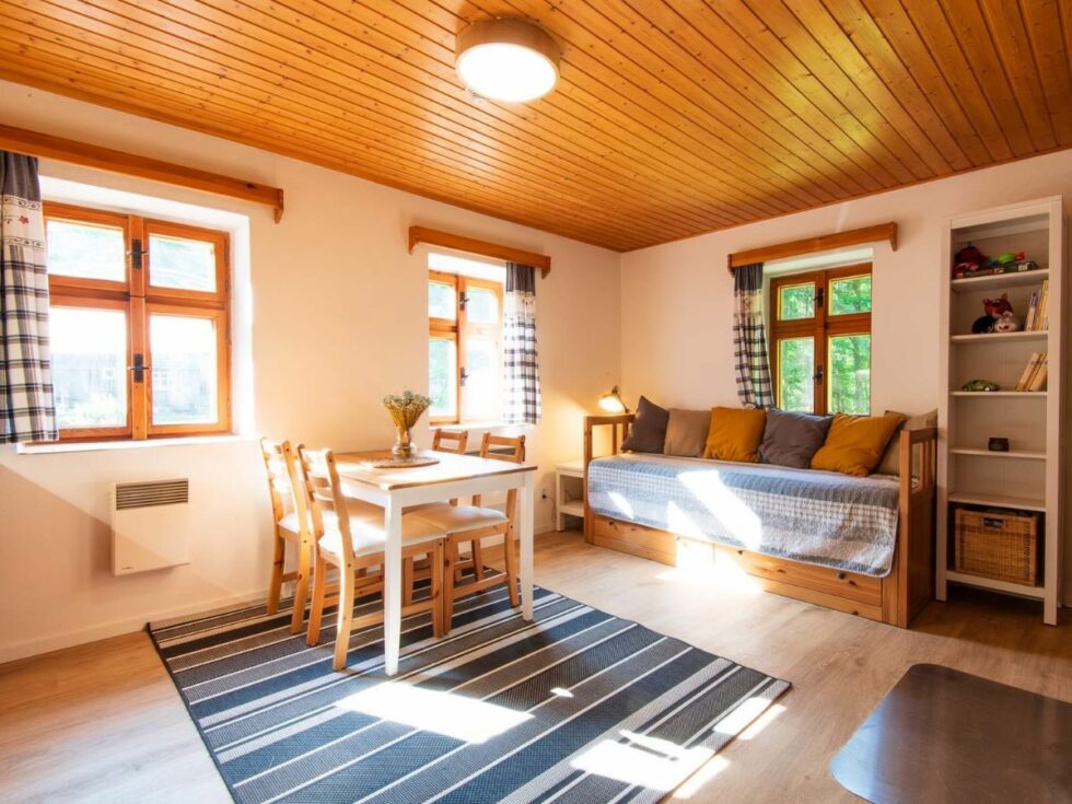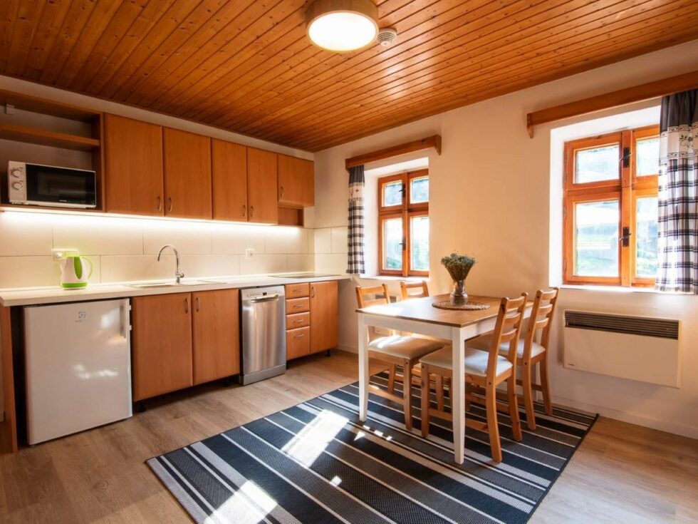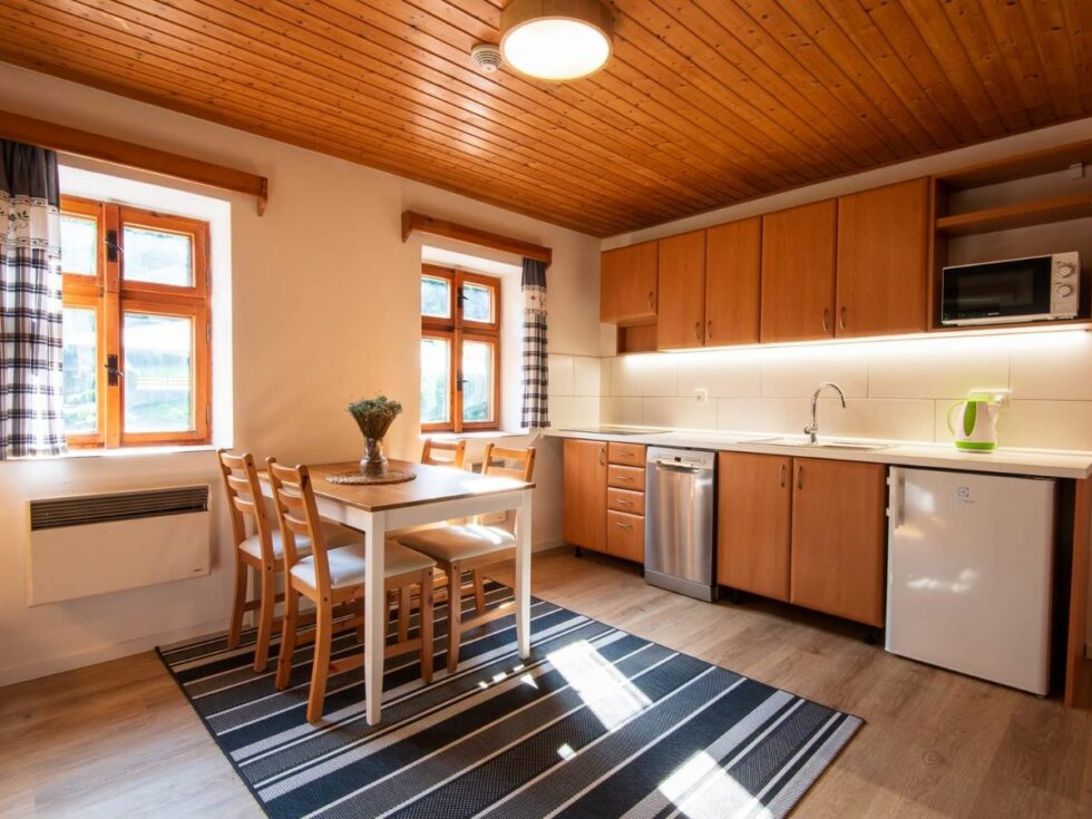Samozřejmostí je i vlastní koupelna se sprchovým koutem a toaletou. Podlahové topení je jak v koupelně, tak na chodbě. V obýváku vás pak zahřejí krbová kamna (brikety i dřevo máte zdarma po celou dobu pobytu). Dále zde najdete plně vybavenou kuchyň s posezením a pohodlnou sedačkou.
